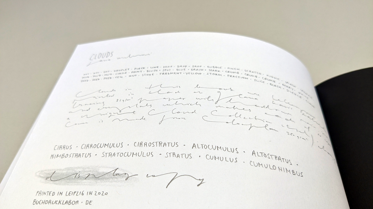Wolken sind in jedem Sinne das Gegenteil dessen, was wir uns vorstellen: Sie sind nicht leicht und fluffig, sondern gigantische Ansammlungen von Wasser; sie können massiv sein, dunkel und schwer. Gedruckt auf Transparentpapier, schweben sie einem trotzdem entgegen und heben sich von ihrem kaltgrauen Hintergrund ab, wenn man durch das Buch blättert.